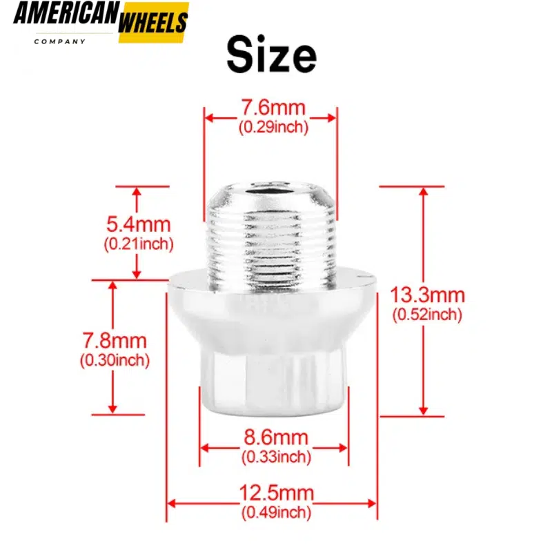 These 12.5mm 0.49in universal decoration wheel rivets nuts fits for 7.6mm 0.3in hole, chrome rivets, minimalist design. Can be used for wheel modification or after-sales. RhinoTuning provides a detailed size drawing for this rivet for reference.