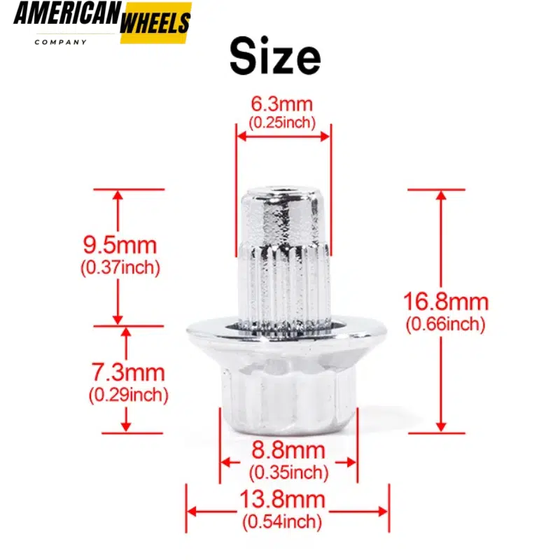 These 13.8mm 0.54in universal wheel edge rivet nuts fits for 6.3mm 0.25in hole, Can be used for after-sales repair and replacement of wheel rivets. RhinoTuning provides a detailed size drawing for this rivet for reference.