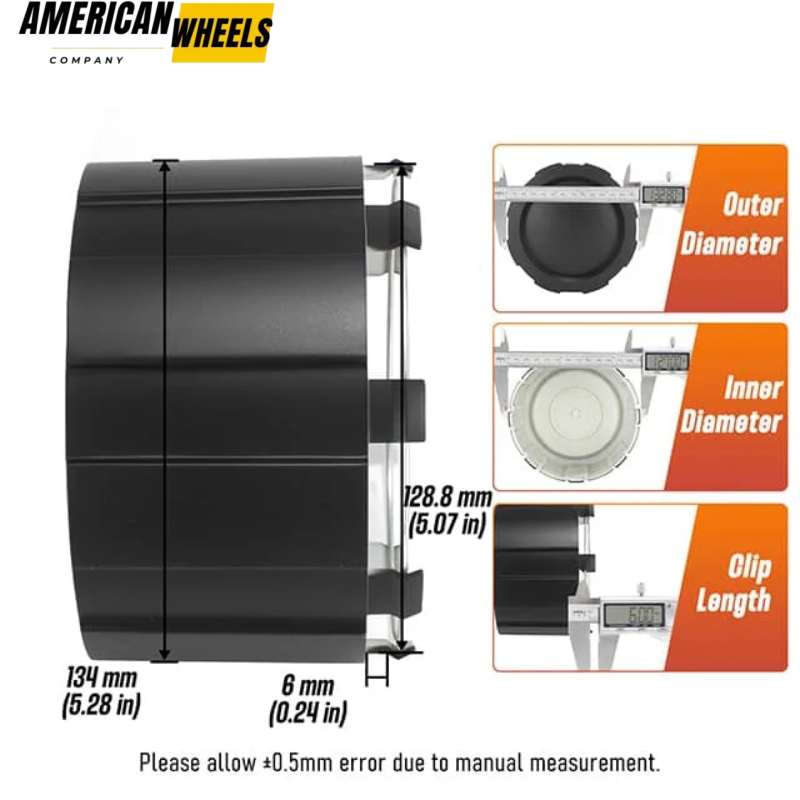 These American Eagle Alloys wheel center cap replacements have an outer diameter of 134mm 5.28in, and an inner diameter of 128.8mm 5.07in. PN: AEWC 3242, 3242-06, ACC3242-06. They are a choice to replace wheel covers, offering protection and aesthetics.