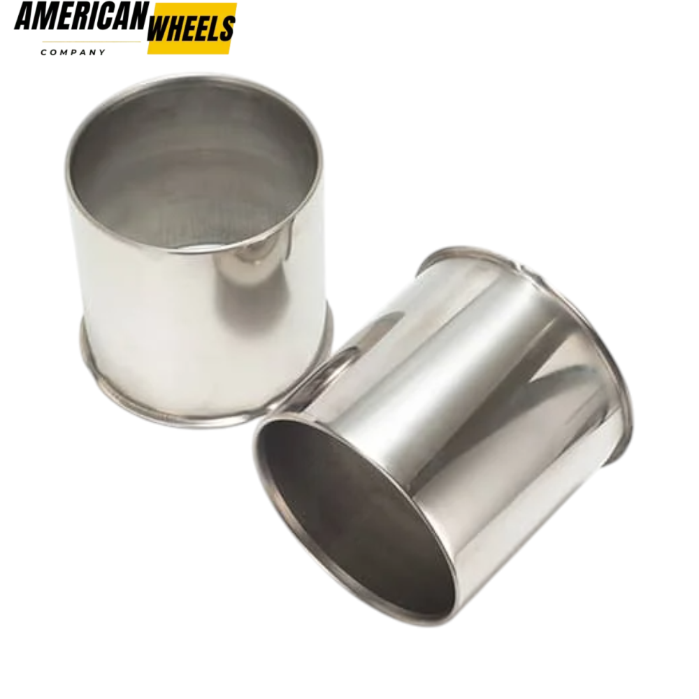 These 2 pcs 4.9in stainless opened push-thru front wheel center hub caps for 4.9in trailer truck caravan RV SUV center bore, 4.8in tall. The material of stainless steel offers triple protection: it resists rust,ย ย water, and dust, and prevents scuffs.