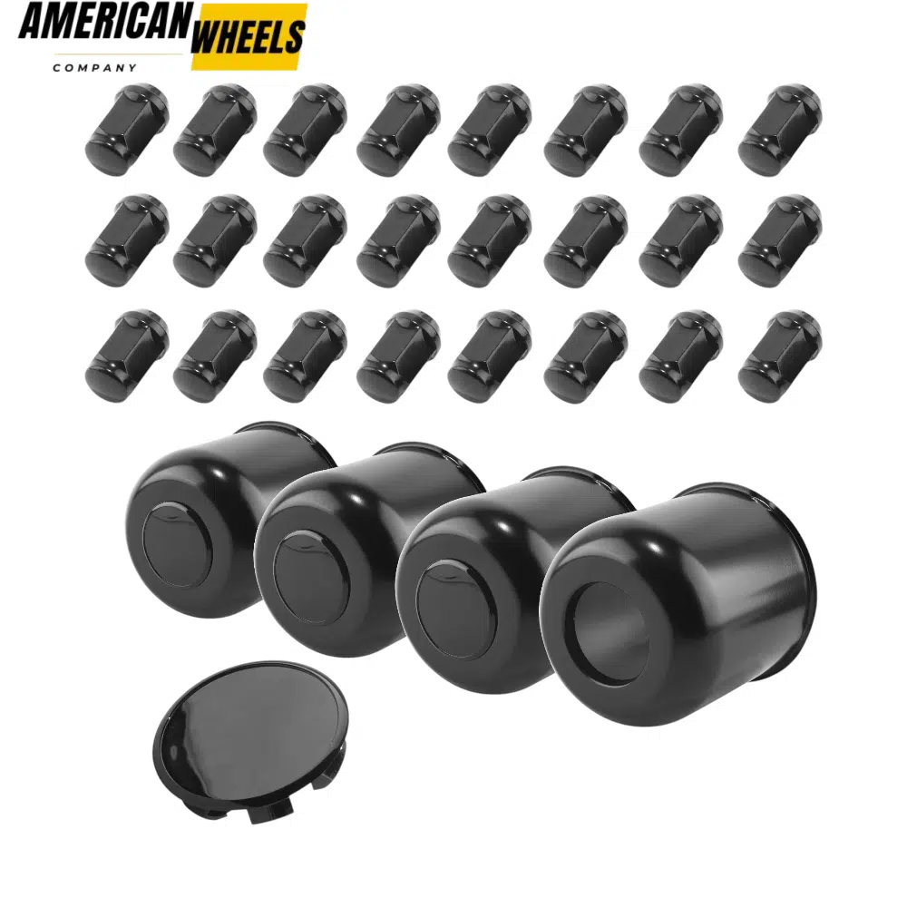 1. Matte Black: 4Pcs Center Caps . 24 Pcs 1/2-20 Lug Nuts (Matte Black Painted Stainless Steel)