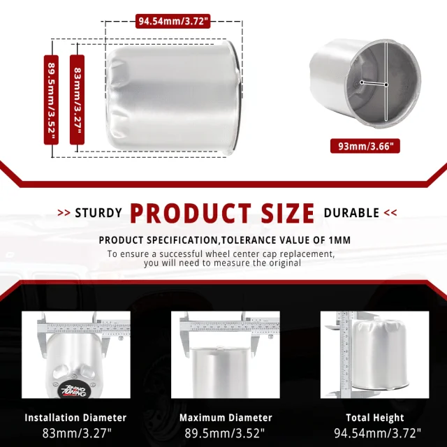These 4pcs 3.27in Rhino Tuning push-thru center caps are compatible with 83mm 3.27in trailer, SUV, truck, and RV hub bore, 93mm 3.66in height, which prevents the screws from rusting,ย ย resists corrosion from road salt to ensure long-lasting performance.