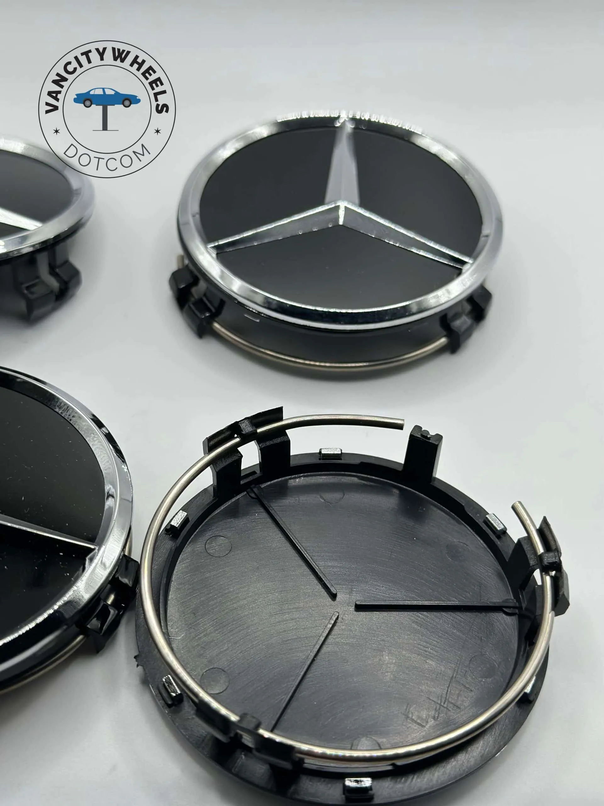 These center caps display the Mercedes-Benz emblem on a black glossy finish that adds classy design elements.