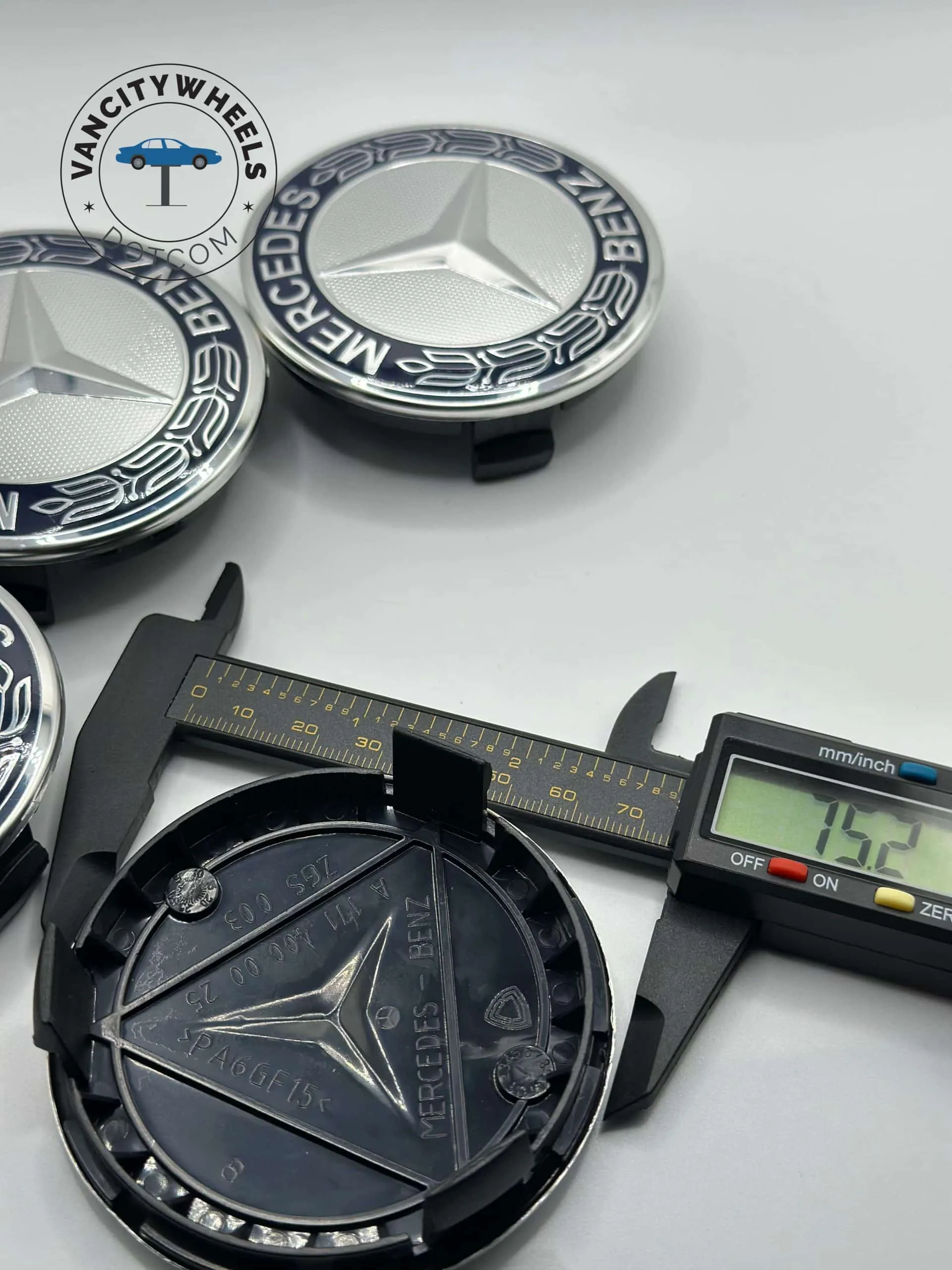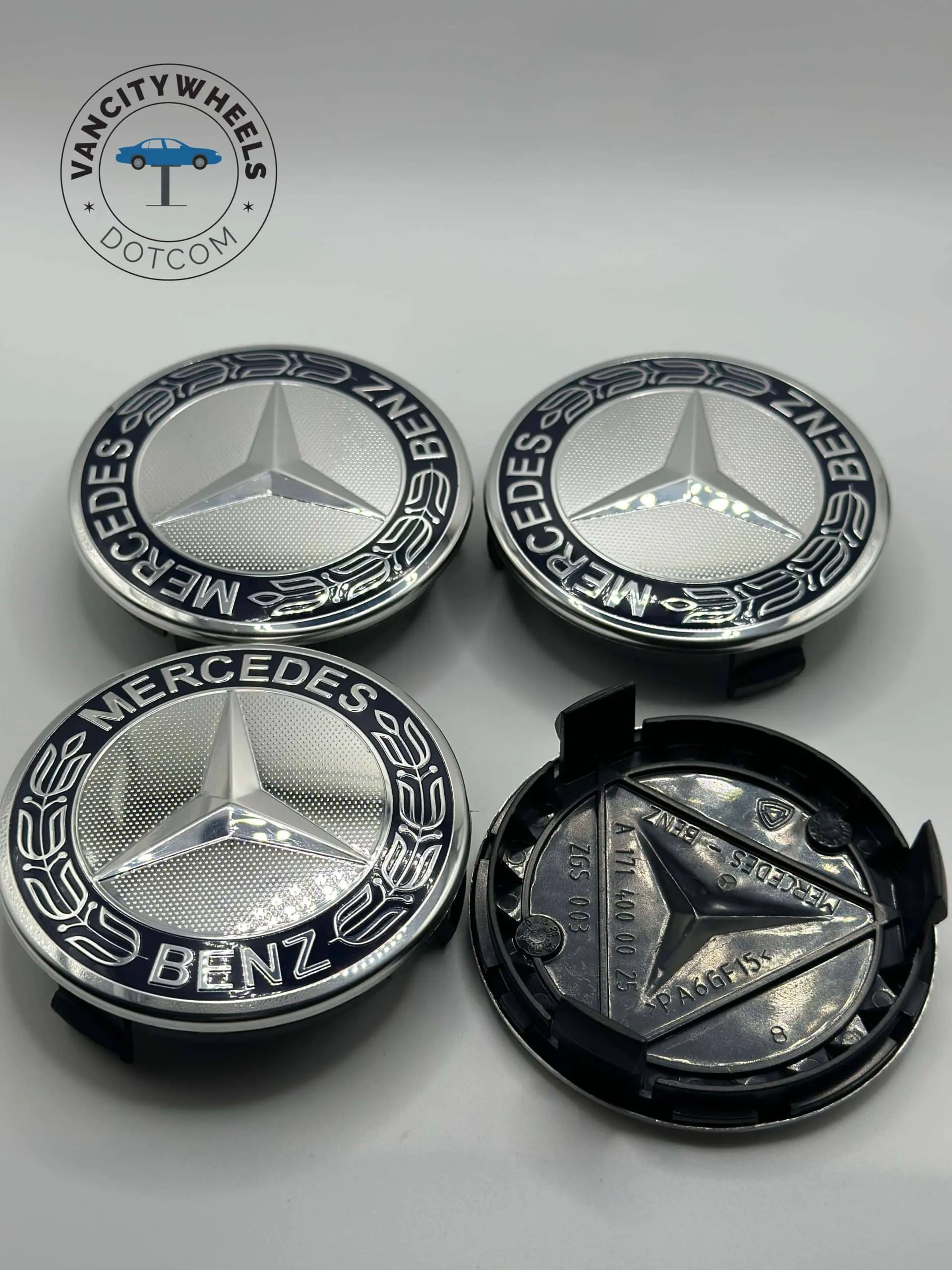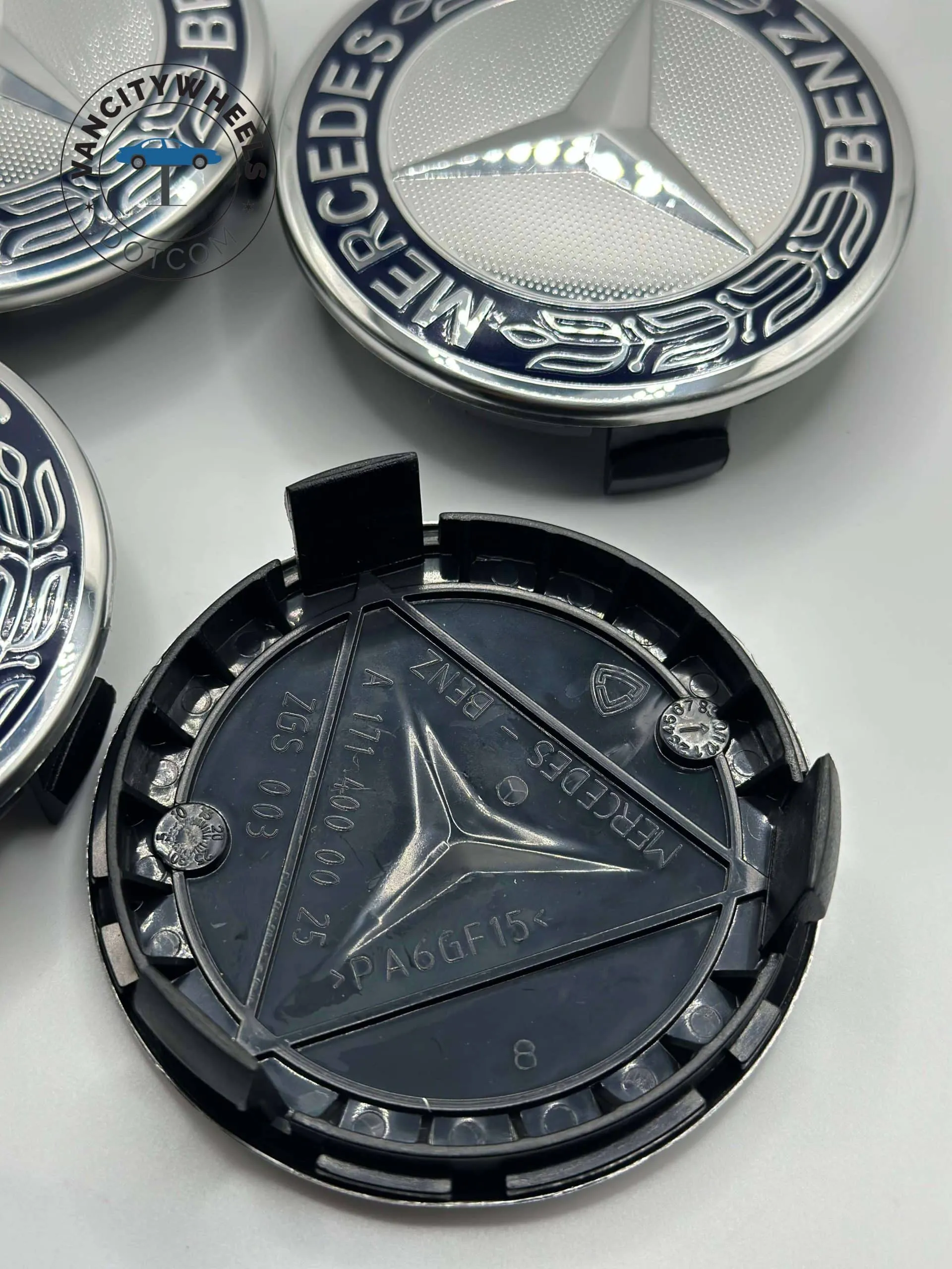 The 4Pcs Mercedes-Benz wheel center caps delivered an emblem logo at 75mm designed exactly like Mercedes-Benz’s original parts.  Each genuine-style ABS plastic center cap secures an aluminum finish and features a dark blue design with a silver laurel wreath emblem for a premium wheel appearance.