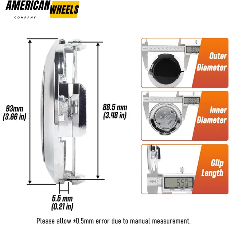 This 93mm fits for 2016-2021 Toyota Land Cruiser wheel center hub caps, part number: 4260B60370. The outer diameter is 93mm 3 21/32in, and the inner diameter is 88.5mm 3 15/32in. These center hub caps are great aftermarket parts.