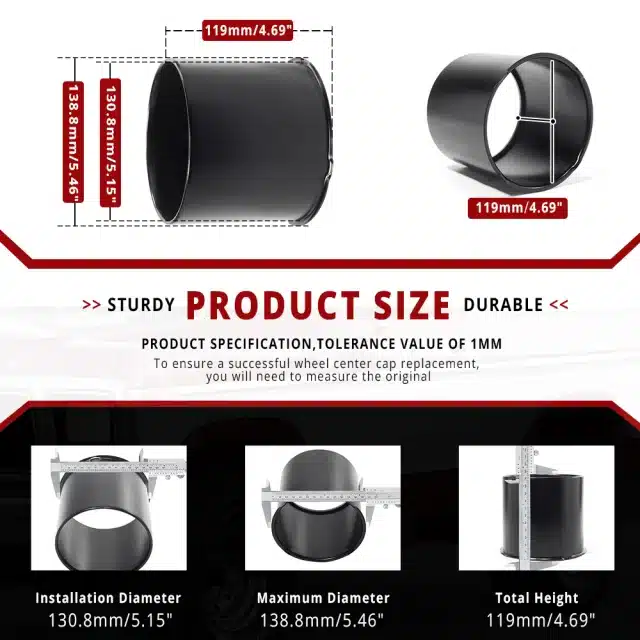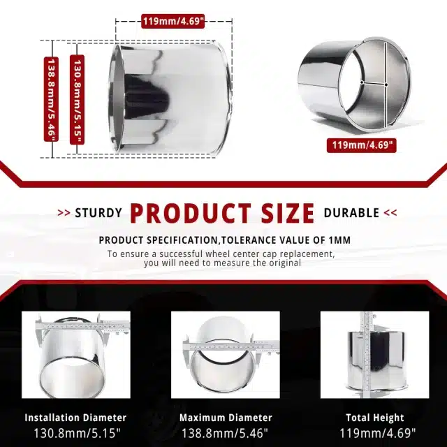These 5.15in opened end push through trailer wheel center caps fit for 5.15in center hub bore 4.69in tall RV truck, trailer, or SUV rims. They are made of carbon steel and their surfaces are treated with mirror chrome plated and matte black painted.