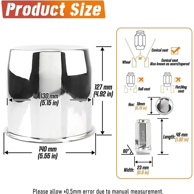 Before purchasing new lug nuts, we recommend matching the flange shape, seat type, and height to your existing ones for proper fit. Since wheel requirements vary, lug nuts/bolts must match your wheelโs specifications. If you’re unsure, feel free to ask us.