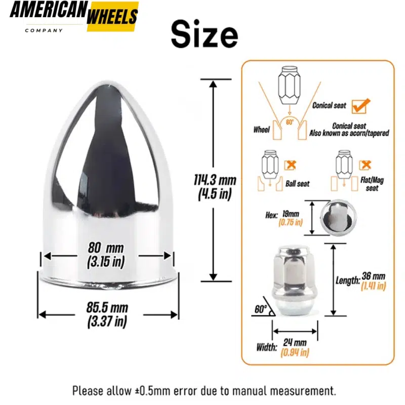 This 3.15in Trailer bullet push through center caps and 1/2-20 lug nuts sets for trailer/truck/SUV/RVs Rims. The top pointed design of the trailer center wheel caps reduces wind resistance and enhances the style and appearance of your car.