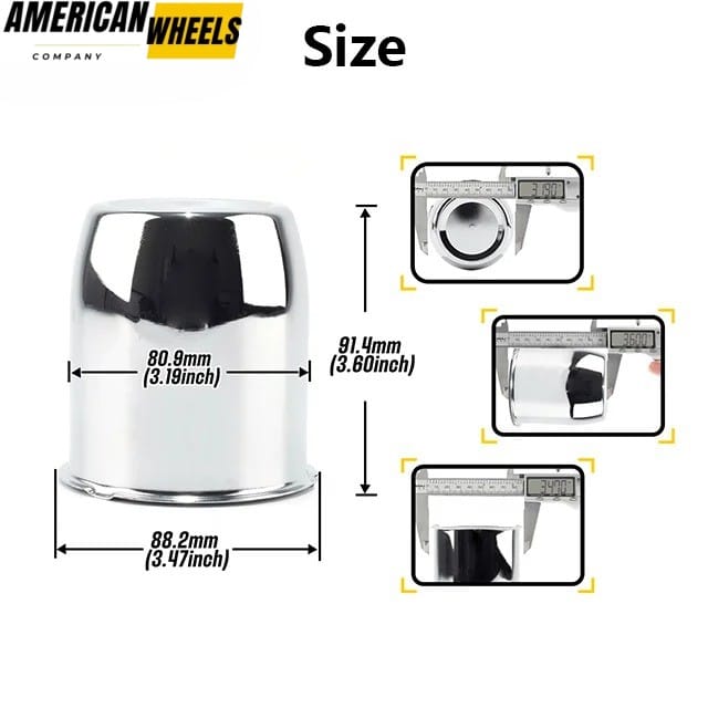 These 3.19in decorative mirror chrome plated / matte black painted stainless steel push through center caps fit for 3.19in rim center bore 3.46in height. They has strong pressure resistance, is rust-proof, and can effectively block dust erosion.