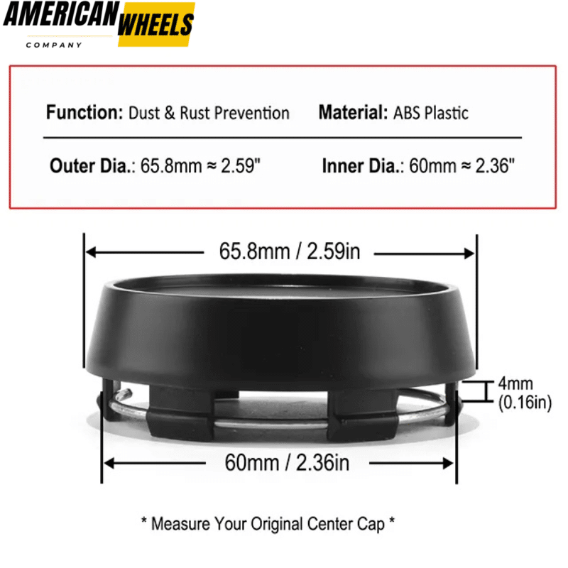 These 66mm 2 9/16in wheel center cap replacements fit for AVID.1 AV-06 / AV-20 wheels. They have an outer diameter of 65.8mm 2.59in, an inner diameter of 60mm 2.36in, and a snap install length of 4mm 0.16in. We have a choice of black and silver.