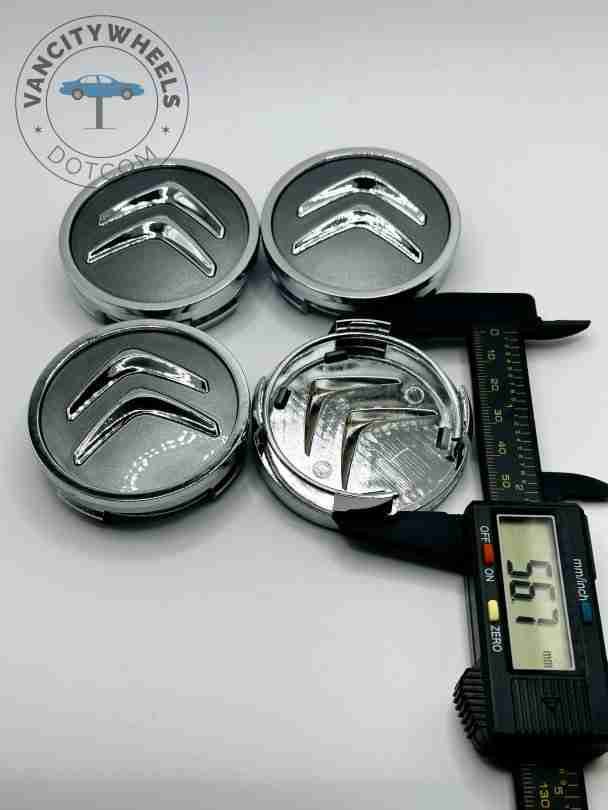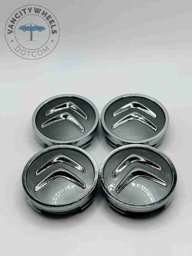 Quantity: Full set of 4 Citroën 60mm Grey and Chrome Wheel Center Caps.