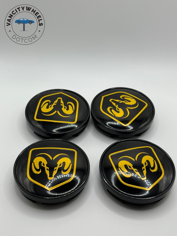 Quantity: Full set of 4 Dodge 60mm Yellow and Black Wheel Center Caps.