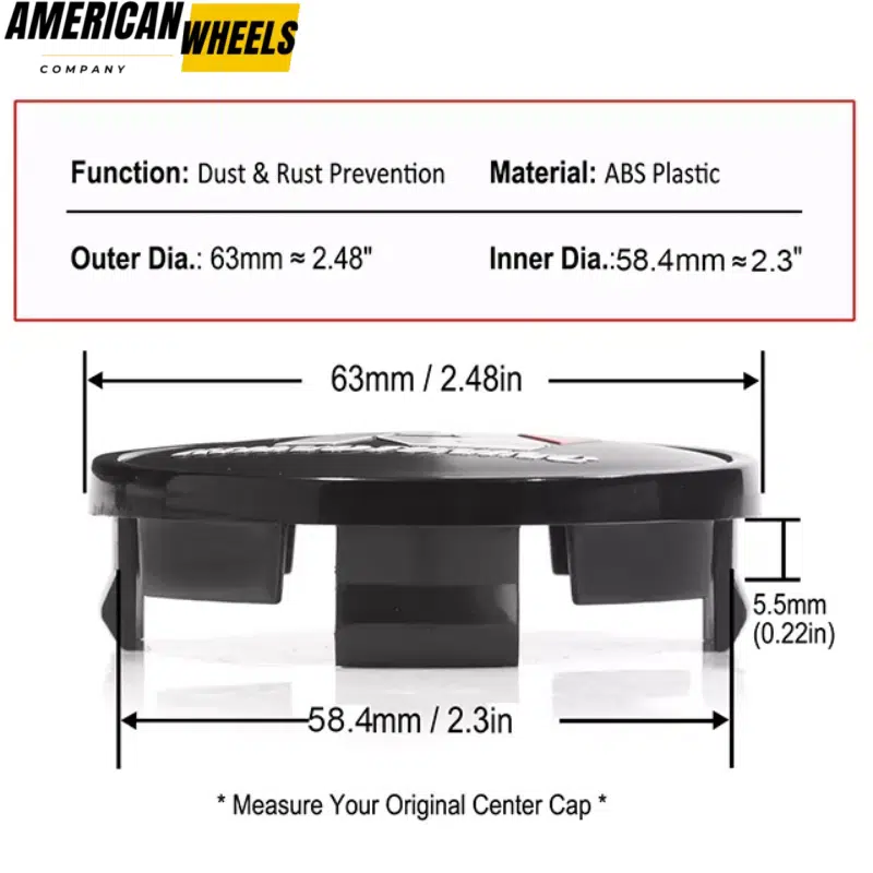 This universal wheel center cap is suitable for Dodge / Chrysler / Jeep / Chevrolet / Toyota / Lexus rims. Part number: 52110398AA 1LB77DD5AC 1LB77SZ0AC 1LB77RXFAB 96452314 42603-AC020 42603-30590 42603-53110. OD: 63mm 2.48in ID: 58.4mm 2.3in.