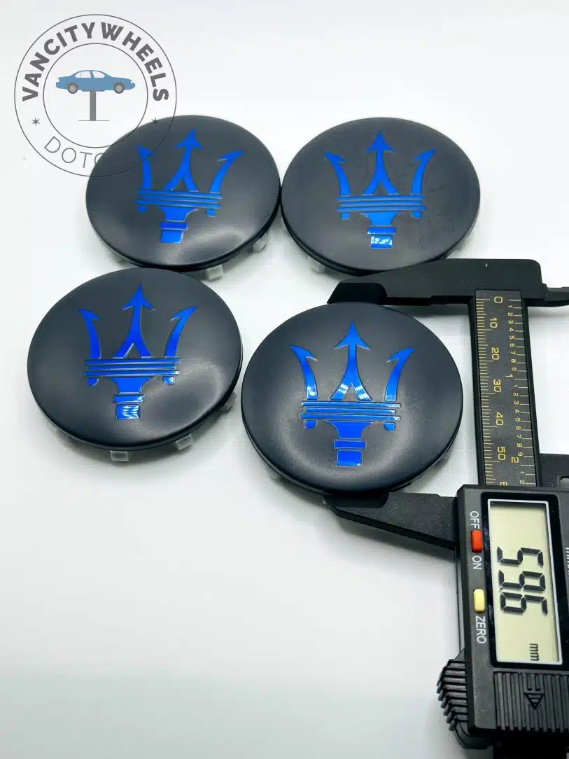 Quantity: Full set of 4 Maserati 60mm Black and Blue Wheel Center Caps.