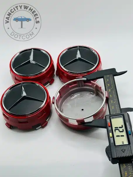 Quantity: Full set of 4 Mercedes-Benz 75mm Black and Red Wheel Center Caps.