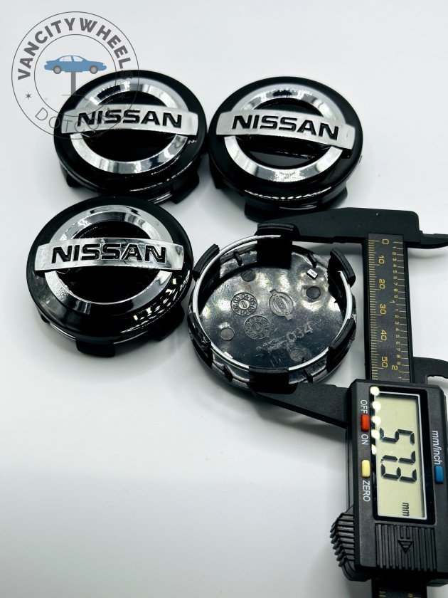 - Nissan, 60mm Wheel Caps, Nissan Black Center Caps, Rogue Accessories, Murano Parts, Black and Silver Nissan Logo, 2.36 Inch Hubcaps, NS034, Vancity Wheels, Nissan Tuning.