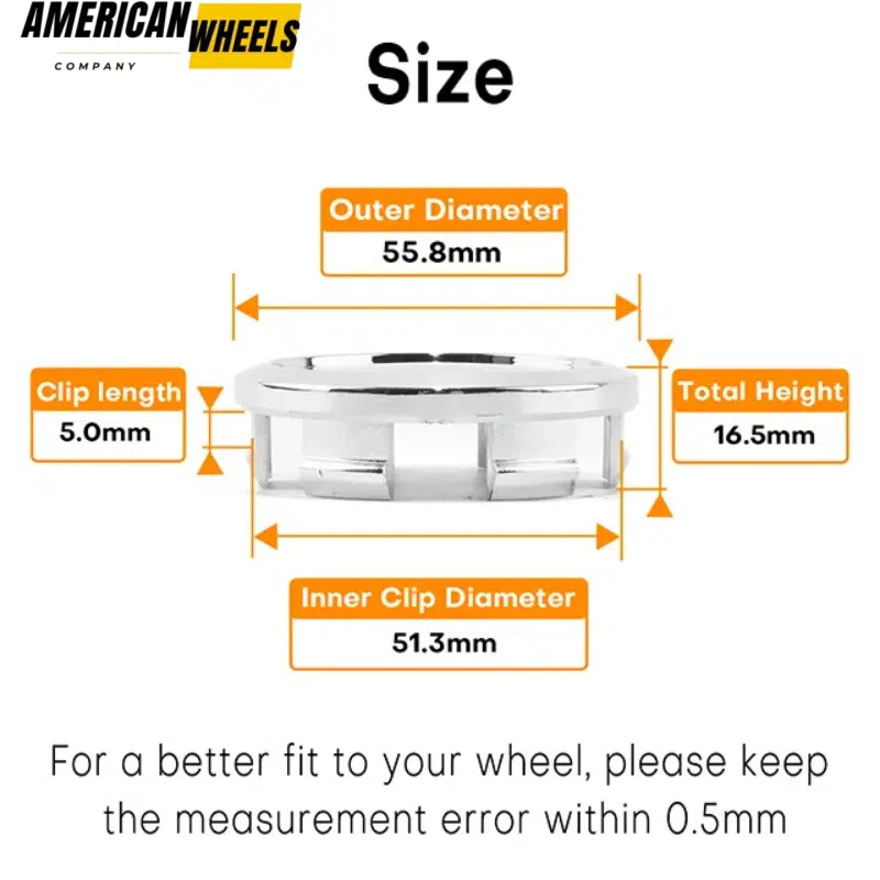 This universal center cap features an outer diameter of 55.8mm 2 3/16in, an inner diameter of 51.3mm 2in, and snap installation length of 5mm 3/16in.The center cap effectively intrusion of sand,soil,long-term protection for the wheel center axle.