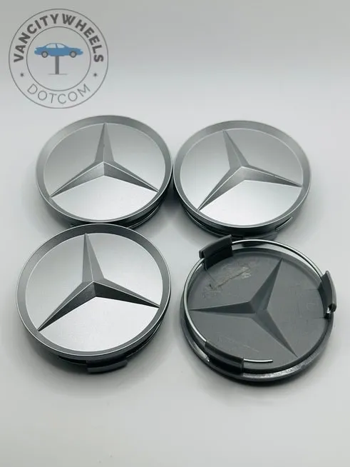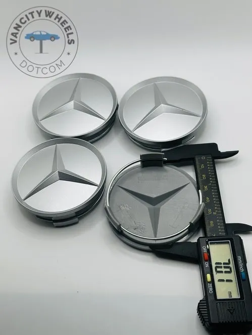 These 75mm silver center hub caps fit most Mercedes-Benz alloy wheels.