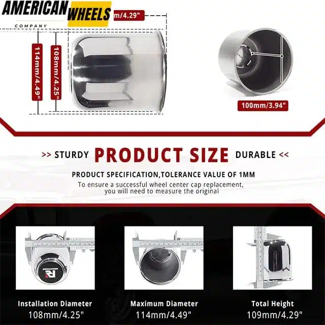 These 4.25 push through center caps fit 4.25in trailer rims center hole, 3.94in tall. Made of stainless steel, strong and durable. They are the perfect replacement and an important car part that protects the center of the rim.