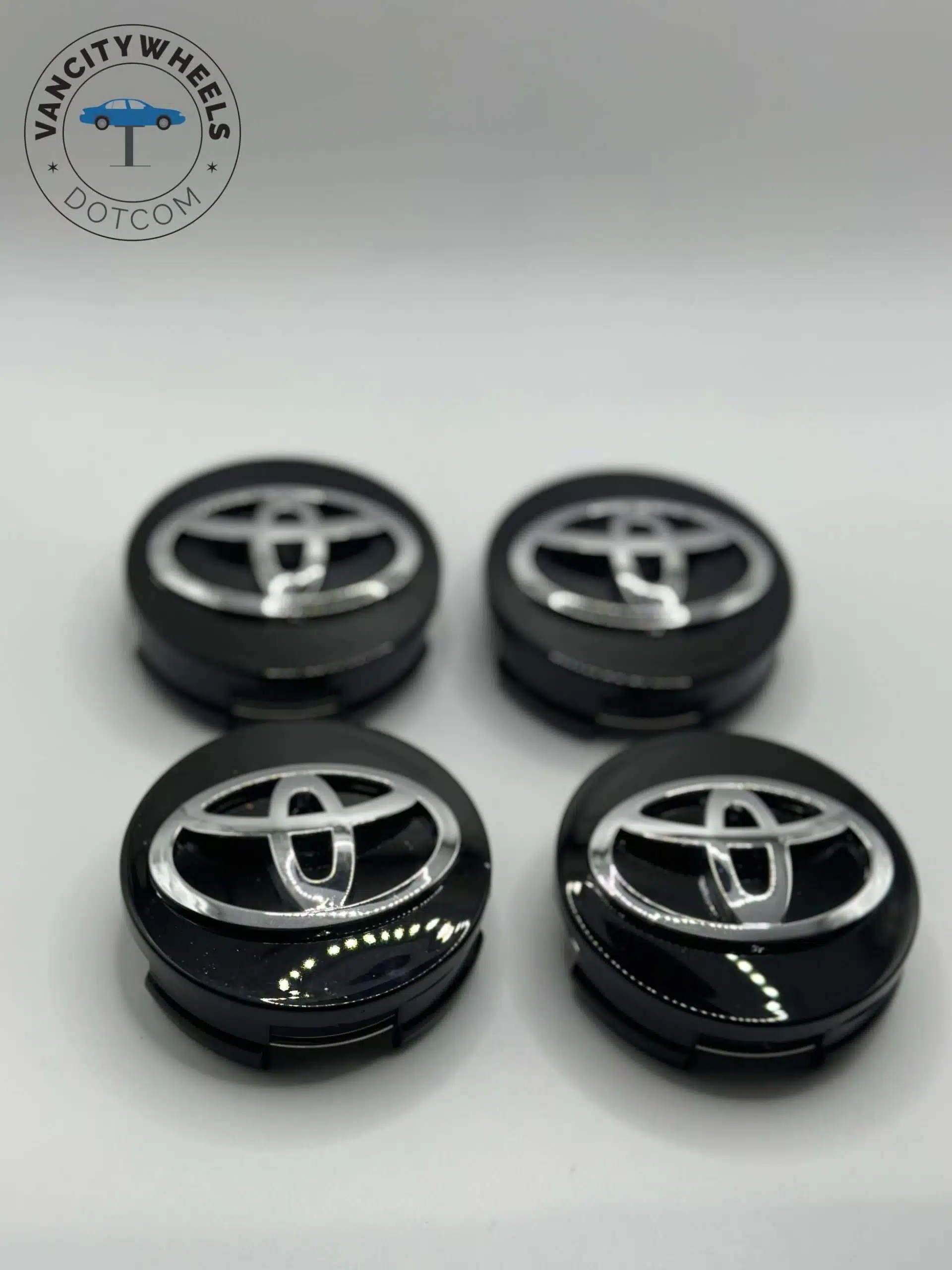 Modernize your Toyota’s profile with this set of four Toyota 62mm Black Wheel Center Caps. Featuring a deep gloss black face and a polished chrome Toyota emblem, these 2.5-inch caps are the perfect “Black Edition” upgrade for factory alloy wheels, offering a sleek alternative to standard silver centers.